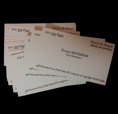 358 exchange place new york, n.y. Too much headspace and a huge gap between center mainline and footer. In the original segment, a group of arrogant young investment bankers gather in a conference room to drool over the subtle variations between their business cards. Patrick bateman business card american psycho business card 3d | etsy. Hotelbedsheets · нояб 9, 2018.